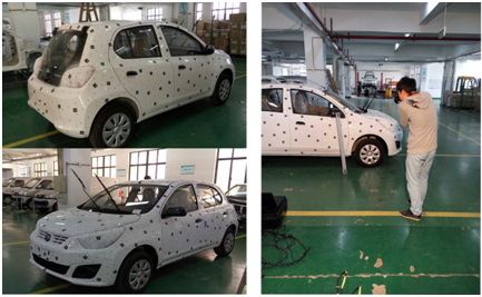 流程: 以下圖掃描整車為例,首先,為整車布點,并用全局?jǐn)z影測量系統(tǒng)獲取標(biāo)記點的空間三維數(shù)據(jù)。